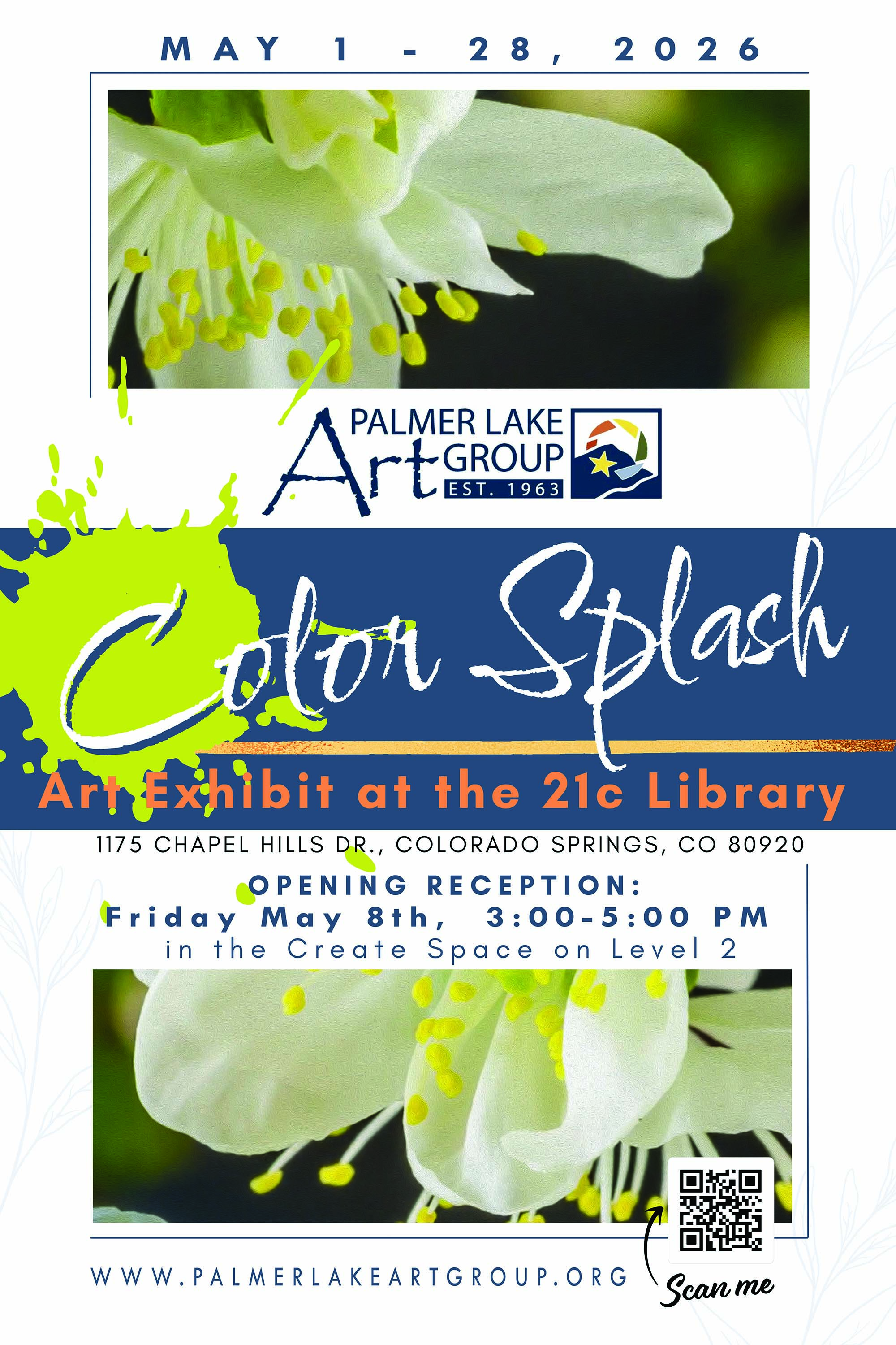With the onset of spring comes the excitement of our crown jewel annual exhibition, “Color Splash”, with this year’s exhibit being held at Library 21c in Colorado Springs. This gallery is a two story space filled with light from the skylights above and is located directly across from the library’s multiple Create Space multi-purpose rooms. A large screen TV located in the main lobby will be rotating PLAG information and photos of artist’s works and each piece displayed will be labeled with a QR Code that opens to a list of artist contact information describing all pieces available for purchase. Art sales are commission free.